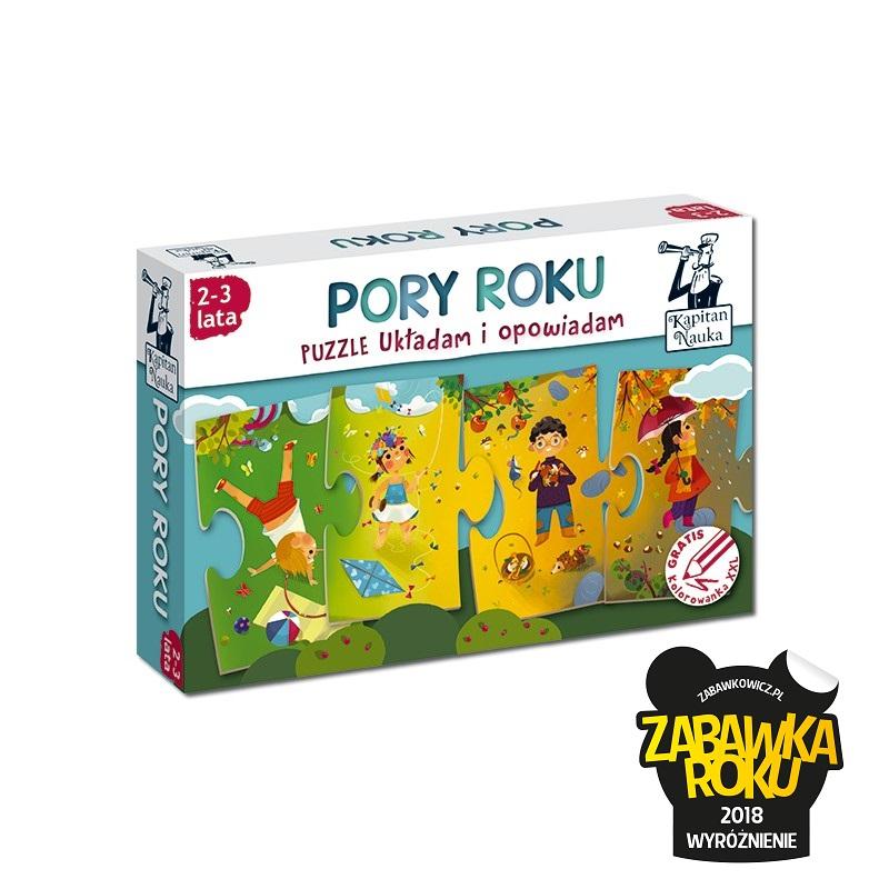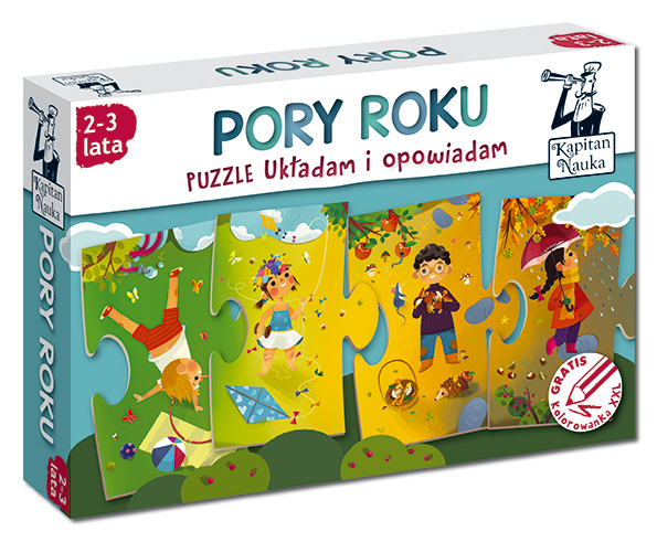 Pory roku to wyjątkowa, dłuuuga układanka przygotowana z myślą o najmłodszych dzieciach. Duże, trwałe, wykonane z grubej tektury elementy z łatwością dopasuje do siebie nawet dwulatek. Dzięki dużemu formatowi 10-częściowych puzzli zabawa dostarczy dzieciom wiele radości, ćwicząc przy tym motorykę małą, umiejętność rozpoznawania kształtów i dopasowywania elementów.