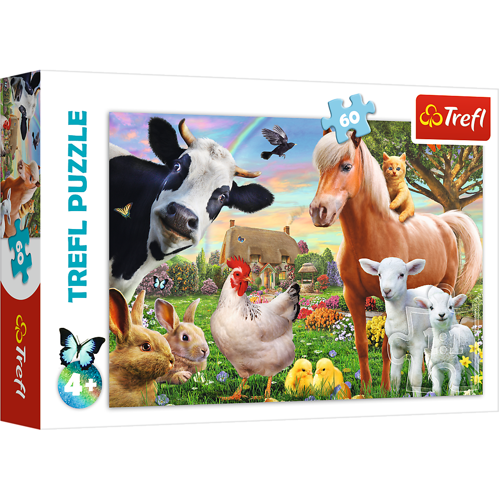 Puzzle 60 elementów ze zwierzętami wiejskimi. Po ułożeniu powstanie obrazek o wymiarach 33x22 cm. Wysoką jakość, nasycenie kolorów i bezpieczeństwo układania zapewnia kalandrowany papier odbijający światło, pokryty ekologicznymi farbami spożywczymi.