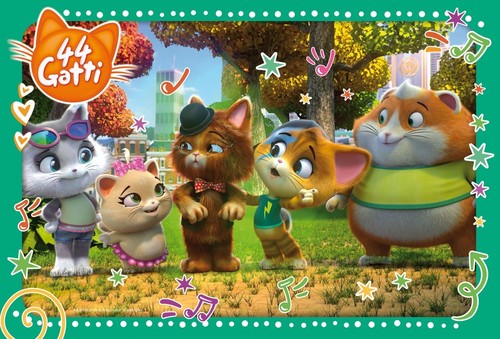 Wyjątkowe puzzle dwustronne inspirowane bajką 44 Koty. Opowiada ona o przygodach 4 kotów, które postanawiają stworzyć zespół muzyczny zwany Arcykotami. Jako miejsce ich schadzek wybierają stary garaż, który po zaadaptowaniu służy również jako miejsce spotkań innych bezdomnych kotów z okolicy. Zawartość opakowania umożliwia ułożenie obrazka o rozmiarze 70x35 cm, który widnieje na opakowaniu, a także pokolorowanie jego czarno-białego szablonu znajdującego się na odwrocie.