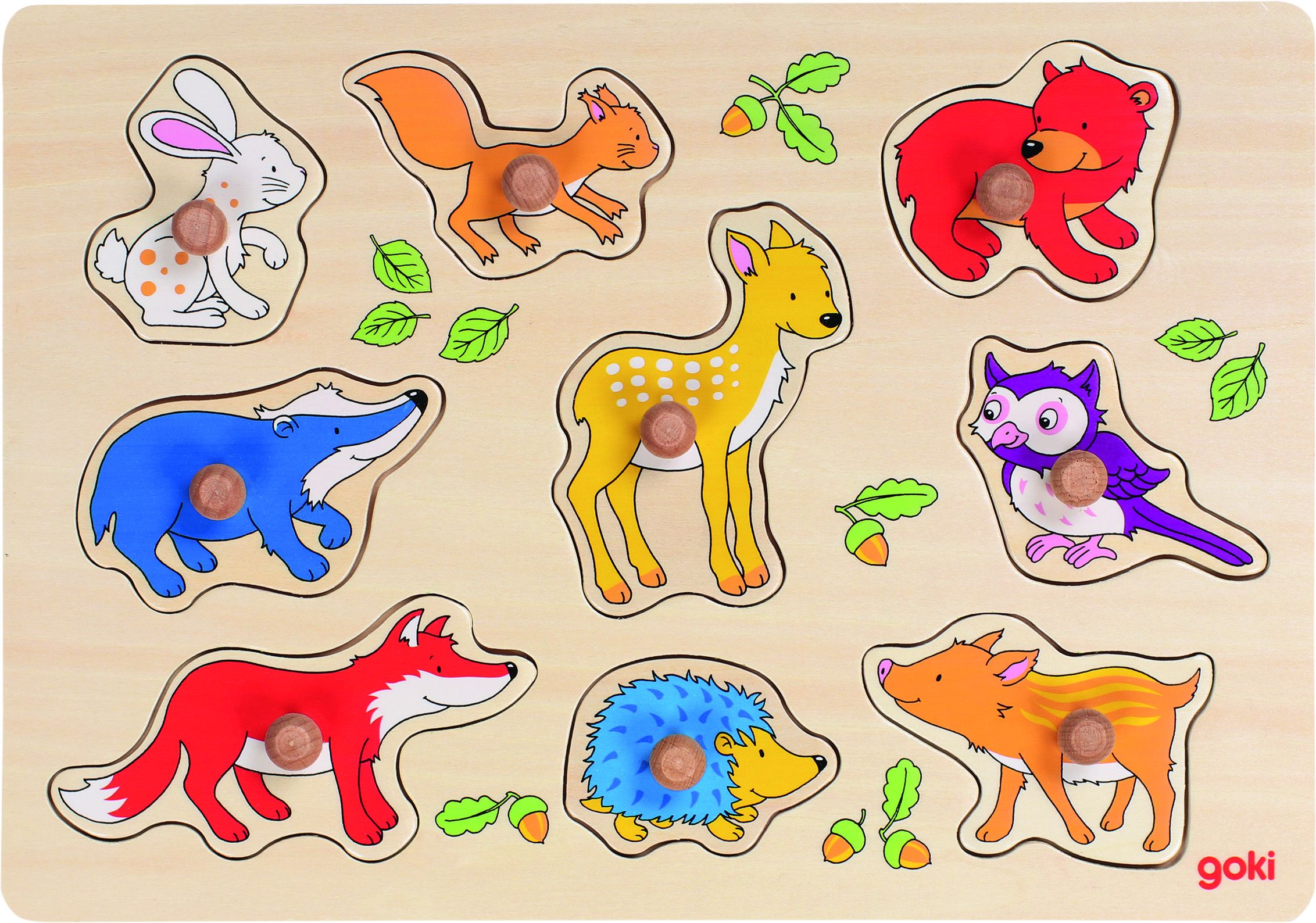 Drewniane puzzle z uchytami Goki przedstawiają 9 sympatycznych leśnych zwierzątek. Dziecko podczas zabawy poznaje nazwy zwierząt oraz rozwija umiejętność chwytania i dopasowywania elementów do ich miejsc na planszy. Goki to producent drewnianych zabawek dla dzieci, które wyróżnia styl, żywe kolory, wysoka jakość i innowacyjność. Produkty Goki wspierają rozwój sensoryczny i motoryczny dziecka, skłaniają do logicznego myślenia, a rodzicom pomagają tworzyć zrównoważony styl zabawy bez hałasu i plastiku.