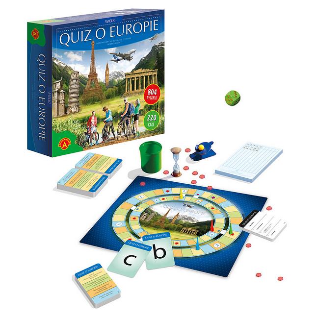 Quiz o Europie - wielki - fascynująca gra i świetna zabawa, w trakcie której uczestnicy odpowiadają na pytania o Europie. Gracze mogą odpowiadać na 804 pytania z 201 kart, a do wyboru mają 2412 odpowiedzi. Tematami pytań i odpowiedzi są: historia, geografia i przyroda, nauka i technika oraz kultura i sztuka Europy. W czasie gry można wykazywać się również swoją zręcznością, strzelając z katapulty do celu. Quiz o Europie to atrakcyjna i emocjonująca rozrywka dla całej rodziny, a jej uczestnicy mogą jednocześnie poszerzyć swoją wiedzę o Europie.