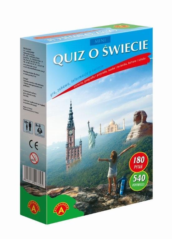 Quiz o Świecie - fascynująca gra i świetna zabawa, w trakcie której uczestnicy odpowiadają na pytania dotyczące historii, geografii i przyrody, nauki i techniki oraz kultury i sztuki świata. Na 45 kartach jest 180 pytań i 540 wariantów odpowiedzi. Podczas gry trzeba wykazać się również swoją zręcznością, strzelając z katapulty do celu. Quiz o Świecie to atrakcyjna i emocjonująca rozrywka dla całej rodziny, a jej uczestnicy mogą w czasie zabawy poszerzyć swoje informacje o świecie.