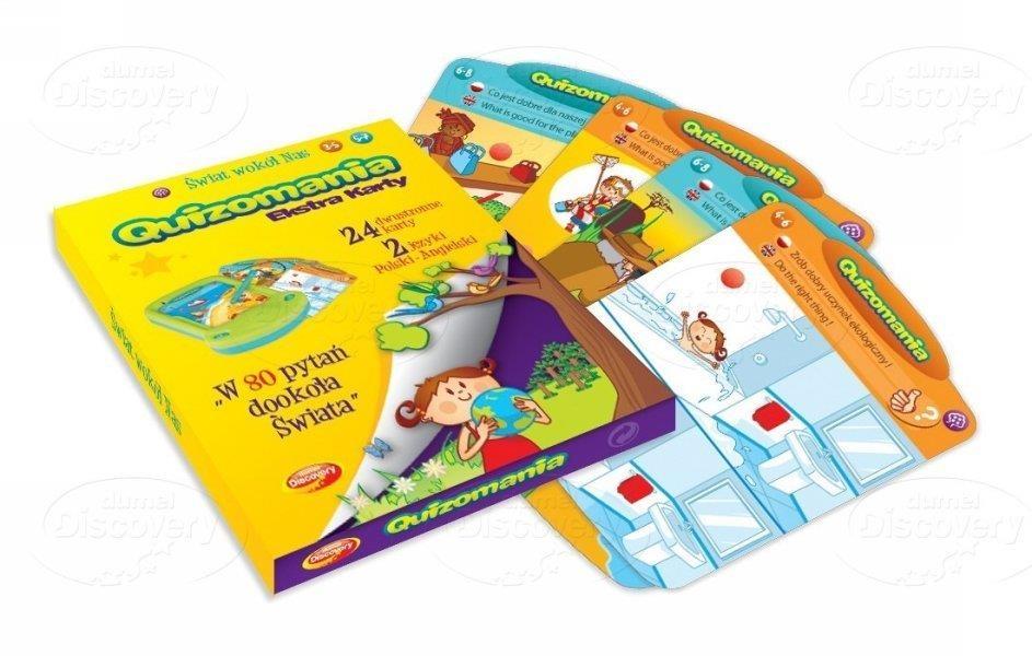 Zestaw 24 dwustronnych kart, w języku polskim i angielskim. Jest to uzupełnienie przenośnej edukacyjnej konsoli Quizomania.