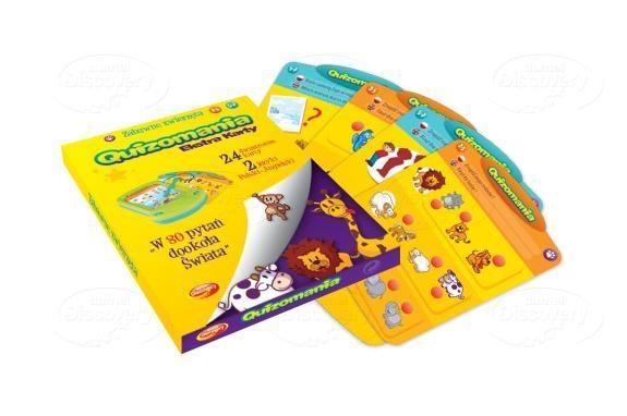Zestaw 24 dwustronnych kart, w języku polskim i angielskim. Jest to uzupełnienie przenośnej edukacyjnej konsoli Quizomania.