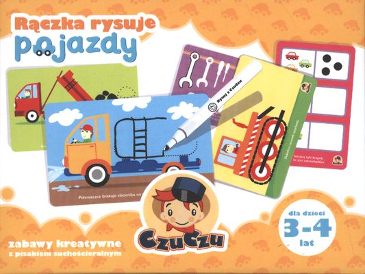 Rączka rysuje Pojazdy Kreatywny zestaw, który pomaga dzieciom: - doskonalić sprawność ręki poprzez ćwiczenia grafomotoryczne, takie jak rysowanie i kontynuowanie po śladzie, uzupełnianie rysunków zgodnie ze wzorem, lustrzane odwzorowywanie; - ćwiczyć spostrzegawczość i koncentrację; - rozwijać kreatywność; - ćwiczyć umiejętność logicznego myślenia i kojarzenia. Każdy zestaw zawiera: ♦ 64 ilustracje na 32 kartach ♦ flamaster suchościeralny ♦ ściereczkę