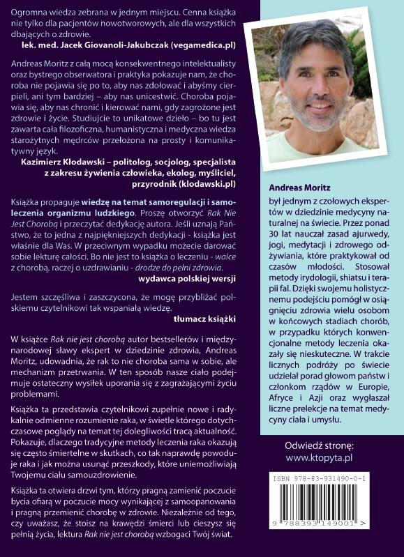 Książki Andreasa Moritza należałoby przetłumaczyć na wszystkie języki świata– każdy człowiek zainteresowany leczeniem prawdziwych przyczyn różnych dolegliwości powinien mieć możliwość poznania tych lektur. Jestem szczęśliwa i zaszczycona, że mogę przybliżać polskiemu czytelnikowi tak wspaniałą wiedzę. W książce “Rak nie jest chorobą” autor bestsellerów i międzynarodowej sławy ekspert w dziedzinie zdrowia, Andreas Moritz, ukazuje, że rak to nie choroba sama w sobie, ale mechanizm przetrwania. W ten sposób nasze ciało podejmuje ostateczny wysiłek uporania się z zagrażającymi życiu problemami. Książka ta przedstawia czytelnikowi zupełnie nowe i radykalnie odmienne rozumienie raka, w świetle którego dotychczasowe poglądy na temat tej dolegliwości tracą aktualność. Pokazuje, dlaczego tradycyjne metody leczenia raka okazują się często śmiertelne w skutkach, co tak naprawdę podwoduje raka i jak można usunąć przeszkody, które uniemożliwiają Twojemu ciału samouleczenie. Książka ta otwiera drzwi tym, którzy pragną zamienić poczucie bycia ofiarą w poczucie siły i panowania nad własnym losem (ang. self-mastery), a chorobę w zdrowie. Niezależnie od tego, czy uważasz, że stoisz na krawędzi śmierci lub cieszysz się pełnią życia, lektura „Rak nie jest chorobą” wzbogaci Twój świat.