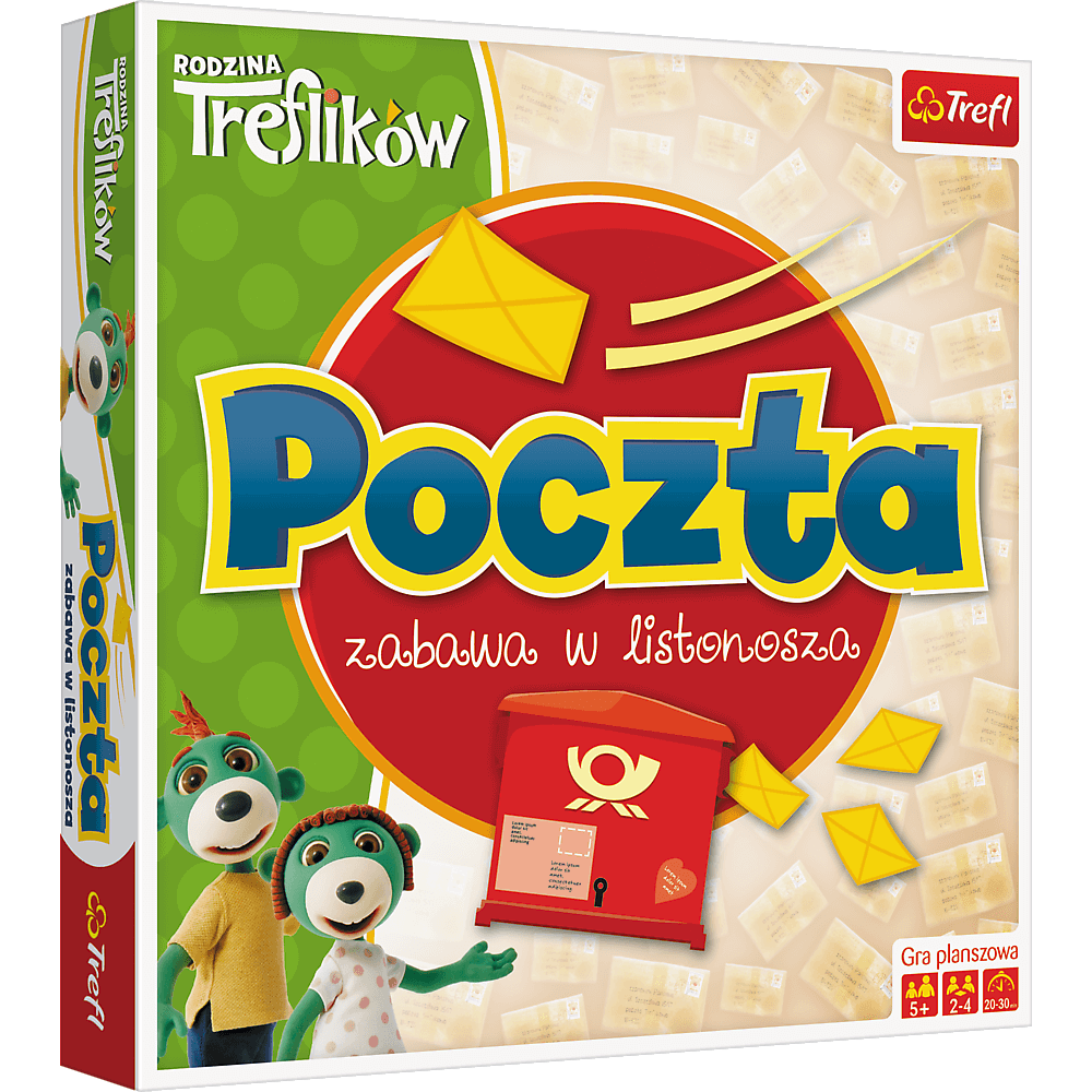 Rodzina Treflików - Poczta: zabawa w listonosza to rodzinna gra planszowa opartna na licencji serialu Rodzina Treflików. Tym razem bohaterowie popularnej bajki mają za zadanie dostarczyć listy i paczki postaciom z popularnej bajki. Odwiedź miejsca znane z serialu i sprawdź, czy mieszkańcy są w domu. Masz przecież dla nich list!