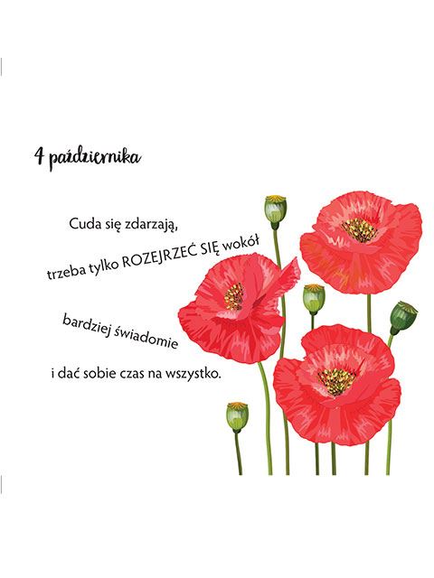 Subtelna i poprawiająca nastrój grafika będzie z pewnością oryginalną ozdobą oraz miłym i zaskakującym akcentem każdego poranka. Spraw przyjemność sobie, a może przede wszystkim wyjątkowej dla ciebie osobie. Spraw komuś radość przez 365 dni niezależnie od roku. Możesz zacząć żyć pozytywnie w dowolnym dniu! x