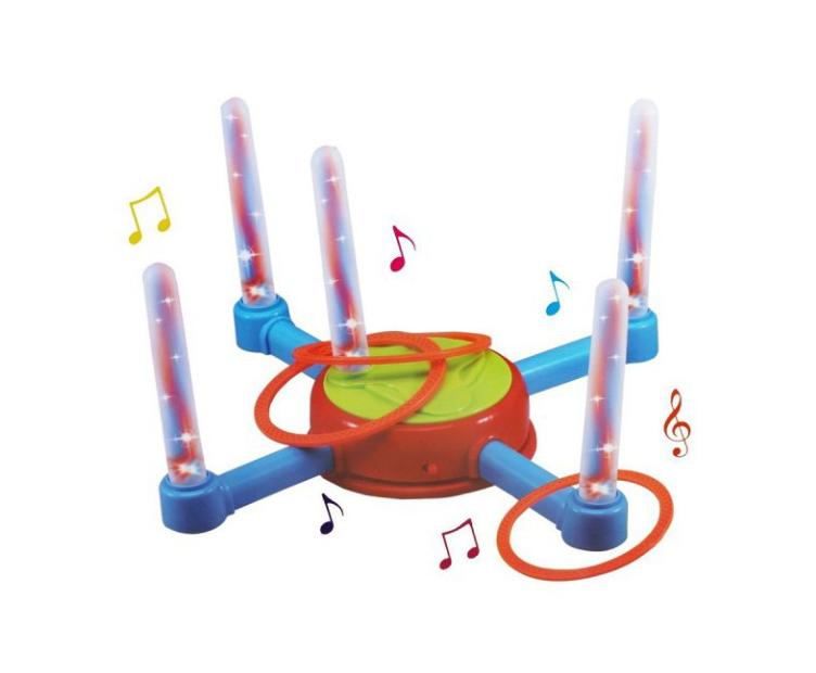 Kolorowy, interaktywny zestaw do zabawy dla małych i dużych dzieci. Idealna zabawka zręcznościowa dla całej rodziny. Poprawia sprawność ruchową, chwytność i celność. Kolorowy zestaw 5 plastikowych kółek i stojak, to propozycja do trenowania celności. Zabawa jest o tyle ciekawa iż zabawka jest zasilana bateriami i po włączeniu jej cała platforma obraca się wokół własnej osi, migając kolorowo światełkami i wesoło grając muzyką. Zabaw murowana, ruch zapewniony, śmiechu i emocji mnóstwo. Zasady gry Zabawa polega na rzucaniu ringami na paliki. W zestawie znajduje się: - platforma - podstawa pod platformę - 4 ramiona - 4 paliki - 5 pomarańczowych kółek Wymiary stojaka: 41 x 41 x 20 cm wymiar opakowania: 41 x 36 x 6cm waga: 0,6 kg baterie: 4 x AA (brak w zestawie) Zabawka posiada certyfikat CE. Przeznaczona jest dla dzieci od 3 roku życia. x