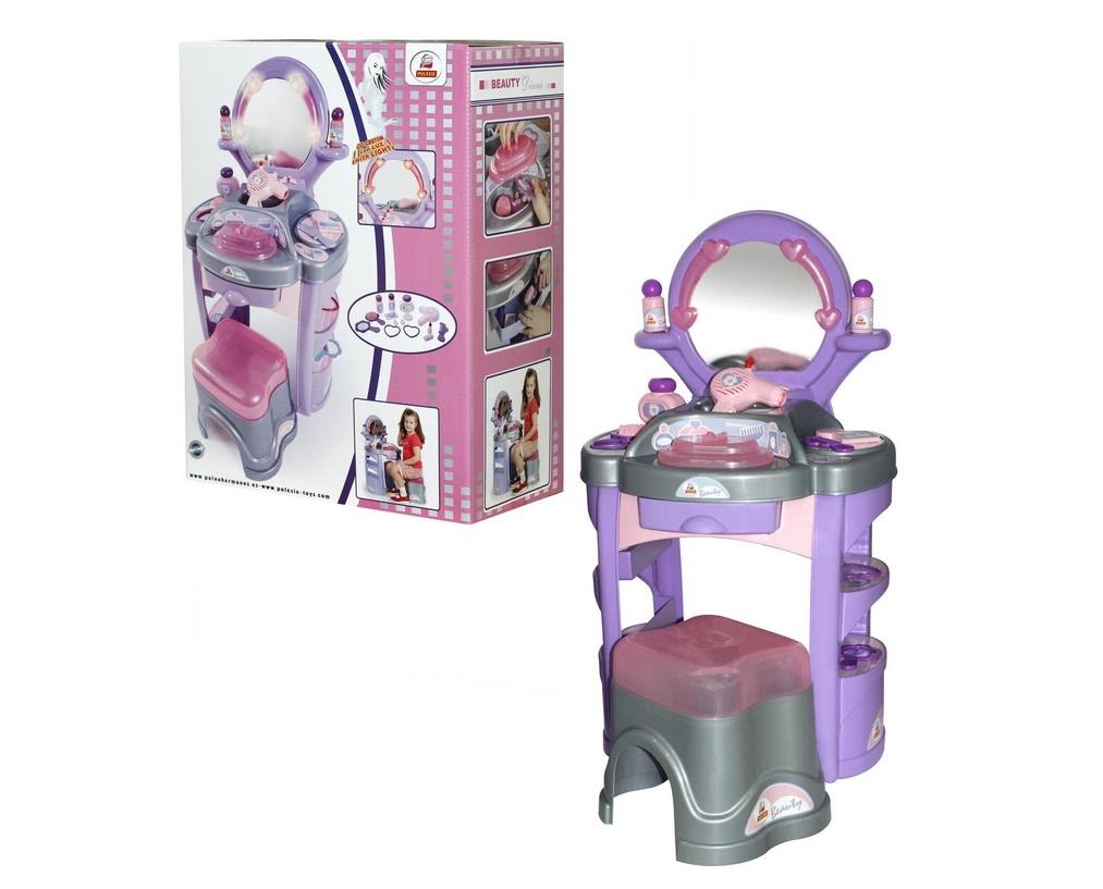 Zestaw SALON PIĘKNOŚCI DIANA NR 4 to urocza toaletka z kompletem niezbędnych akcesoriów. Wyposażona jest w duże, podświetlane lustro, blat z licznymi przegródkami oraz wysuwaną szufladą, półki na liczne bibeloty oraz plastikową pufę, na której może bezpiecznie przesiadywać nasza mała modnisia. Dodatkowo do zestawu dołączono: trzy pojemniki na kosmetyki, suszarkę, grzebień, małe lustereczko, szminkę, szczotkę, dwie bransoletki, puderniczkę, komplet cieni do oczu oraz kolczyki. Zatem jest wszystko, co zagwarantuje dobrą zabawę.