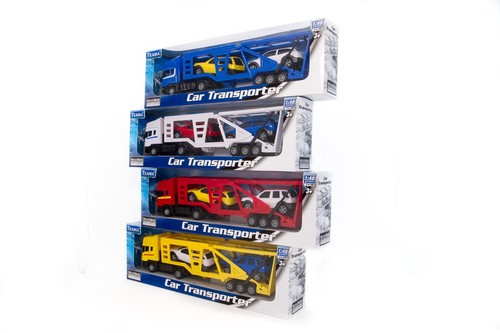 Plastikowy model samochodu Scania z dwoma autami na lawecie w skali 1:48