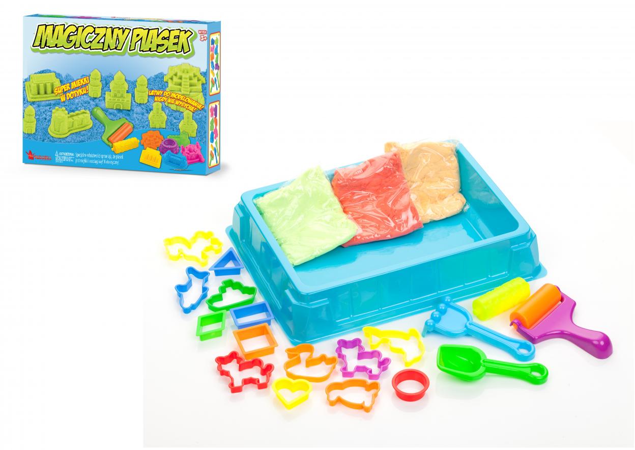 2 opakowania piasku kinetycznego po 300g , 8 foremek w kształcie zwierząt i figur, 6 narzędzi do zabawy piaskiem, 1 tacka