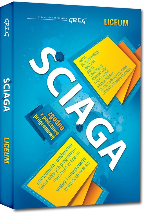 Ściąga do liceum to nowość na rynku, wychodząca naprzeciw potrzebom uczniów, którzy chcą mieć w jednym miejscu treści potrzebne na lekcjach języka polskiego we wszystkich trzech klasach. Eliminuje ona konieczność kupowania wielu różnych pomocy naukowych. Zawiera całość materiału wymaganego w obowiązującej podstawie programowej.Zamieszczono w niej analizy i interpretacje wszystkich najczęściej omawianych wierszy, a także szczegółowe opracowania lektur wymaganych na maturze z języka polskiego oraz omówienia fragmentów Biblii; całość uzupełniają notki biograficzne autorów.Oprócz tego omówiono cechy charakterystyczne każdej epoki literackiej. Książka napisana została przystępnym, zrozumiałym językiem, nie ma w niej niepotrzebnych, ponadprogramowych treści. Będzie doskonałą pomocą przed odpowiedzią, sprawdzianem i egzaminem maturalnym.Gorąco polecamy!