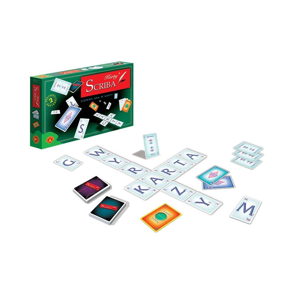 "Scriba - karty" to prostsza i łatwiejsza wersja gier planszowych "Scriba". Dzięki prostym zasadom gry jest wspaniałą rozrywką dla całej rodziny. Gracze otrzymują po 7 kart. Są to punktowe "karty liter" i dodatkowe karty 9 "premi", "blokady" itp.) Każdy z graczy stara się zdobyć jak najwięcej punktów dążąc do ułożenia słów "kartami liter". Gra uczy koncentracji, poszerza zakres słownictwa, znajomość ortografii i jest jednocześnie znakomitą zabawą. Zagraj i przekonaj się sam. Zawartość pudełka: 110 kart, notes, instrukcja.