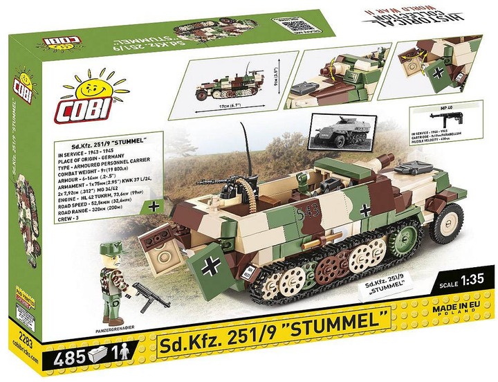 Opis produktuZasady bezpieczeństwaKlockowy transporter opancerzony "Stummel" został opracowany w skali 1:35 pasującej do reszty Historical Collection od COBI. Model składa się z 485 wysokiej jakości elementów, wśród których są również klocki z trwałymi nadrukami. Na szczególną uwagę zasługuje piękny, kolorowy klockowy kamuflaż. Pojazd został wyposażony w ruchome koła z prawdziwymi oponami. Trakcja gąsienicowa składająca się z realistycznych klockowych ogniw pracuje i zachowuje się jak prawdziwa w trakcie poruszania pojazdem. Otwierane tylne drzwi, armata oraz akcesoria dodatkowe uatrakcyjniają zabawę transporterem. Całość zestawu uzupełnia figurka przedstawiająca grenadiera pancernego z dwustronnymi nadrukami oraz klocek z nazwą pojazdu. Jeżeli lubisz budować z klocków własne konstrukcje, to ten pojazd będzie idealną bazą do tworzenia innych wersji tego popularnego transportera! Fani historii i techniki wojskowej znajdą tutaj coś dla siebie! 485 wysokiej jakości elementów, wyprodukowane w UE przez firmę z ponad 20-letnią tradycją, spełniają normy bezpieczeństwa dotyczące produktów dla dzieci, w pełni kompatybilne z innymi markami klocków konstrukcyjnych, klocki z nadrukami nie odkształcają się i nie bledną w czasie zabawy czy pod wpływem temperatury, klockowy model pojazdu, 1 figurka wraz z akcesoriami, dodatkowe akcesoria, skala 1:35 klocki dla dorosłych, którymi mogą bawić się dzieci, Wymiary modelu (dł. x sz. x wys.) 17 cm x 9 cm x 7 cm x