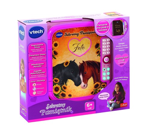 Z Sekretnym Pamiętnikiem marki VTech wszystkie tajemnice będą bezpieczne! Na okładce znajduje się miejsce na zdjęcie właścicielki, a środku przestrzeń na jej sekrety, które można zabezpieczyć czterocyfrowym hasłem. W zestawie oprócz notesu-pamiętnika znajdziesz kolorowy pisak oraz tajemniczy schowek na Twoje skarby! Zabawka posiada wbudowaną możliwość nagrywania głosu i odtwarzania nagrań. Dodaj zabawne efekty dźwiękowe do swoich wyznań, dzięki zmieniaczowi głosu. Z Pamiętnikiem możesz również rozwijać swoje zdolności matematyczne! Sprawdź, czy dodawanie i odejmowanie to Twoja mocna strona.