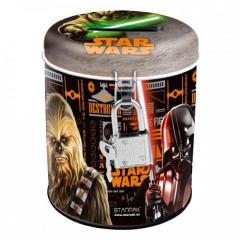 Skarbonka z lakierowanego metalu z otwieranym wieczkiem, zamykana na kłódkę w zestawie z dwoma kluczykami. Idealny pomysł na prezent, który uczy oszczędności i sprawia, że pieniądze są bezpieczne. Skarbonka jest zdobiona ulubioną bohaterami Star Wars.