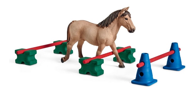 Zestaw slalom dla kucyków 42483. Slalom jest częścią pracy z kucykami i jednocześnie świetną zabawą. Wtedy jednak nie ujeżdżamy kucyka, a prowadzimy go między słupami slalomowymi - na przemian w lewo i w prawo. Slalom wspomaga rozwój inteligencji naszych podopiecznych, jest dobry dla ich zdrowia oraz wzmacnia zaufanie pomiędzy zwierzęciem a treserem. W początkowej fazie korzystamy z kantaru, który po dłuższej nauce staje się zbyteczny i kucyki świetnie radzą sobie same. Przeszkody można łączyć i projektować według własnego uznania. Zestaw odpowiedni dla małych i dużych koni Schleich. Krzyże Cavaletti można łączyć, tworząc ścianę jako przeszkodę w skokach.