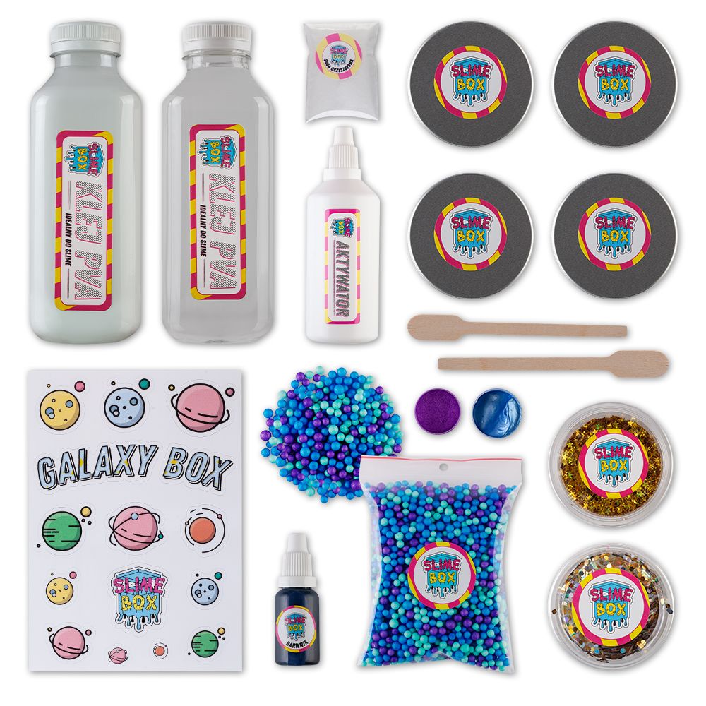 Opis produktuZasady bezpieczeństwaWszystkie dzieci kochają kosmos. Pewnie dlatego, że jest magiczny, tajemniczy i cały czas nieodkryty. Z Galaxy Boxem dzieci przenoszą się w świat kosmicznej zabawy! Zestaw 2 klei w połączeniu z wyjątkowymi dodatkami umożliwi przygotowanie aż 8-10 Galaxy Slime! Znajdziecie w nim: Przezroczysty klej PVA XL (500ml) Biały klej PVA XL (500ml) Aktywator (100 ml) + soda oczyszczona Barwnik fioletowy pigment (dla efektu wow używaj do slime z przezroczystego kleju) Barwnik granatowy perłowy Barwnik niebieski w płynie 2 drewniane szpatułki do barwników Kulki styropianowe niebieskie-fioletowe-miętowe Confetti Holograficzne srebrne/złote gwiazdki Aż 4 pudełka do przechowywania slime z metalową nakrętką! Pakiet naklejek Galaxy OSTRZEŻENIE:PRODUKT NIEODPOWIEDNI DLA DZIECI W WIEKU PONIŻEJ 6 LAT. MAŁE CZĘŚCI. ZAGROŻENIE UDŁAWIENIEM. PRZECHOWYWAĆ POZA ZASIĘGIEM MAŁYCH DZIECI. DO UŻYWANIA POD NADZOREM OSOBY DOROSŁEJ. ZAWIERA SUBSTANCJE MOGĄCE POWODOWAĆ ALERGIE. ZAWSZE NALEŻY PAMIĘTAĆ, BY UMYĆ RĘCE PRZED I PO ZABAWIE SLIME. ZABAWKA DIY - DO SAMODZIELNEGO WYKONANIA SLIME. SLIME PO PEWNYM CZASIE MOGĄ TRACIĆ SWOJE WŁAŚCIWOŚCI (WRACAĆ DO FORMY PŁYNNEJ LUB PLEŚNIEĆ). GOTOWEGO SLIME NAJLEPIEJ PRZECHOWYWAĆ W CIEMNYM POMIESZCZENIU ORAZ W NISKIEJ TEMPERATURZE NP. W LODÓWCE. W PRZYPADKU POJAWIENIA SIĘ PLEŚNI NALEŻY WYRZUCIĆ SLIME I STWORZYĆ NOWEGO. x