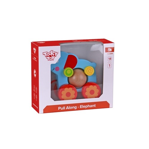 Drewniany Słoń ma kółka i sznureczek do ciągnięcia. Dziecko, które opanowało zdolność samodzielnego chodzenia może zabrać Słonia na spacer.