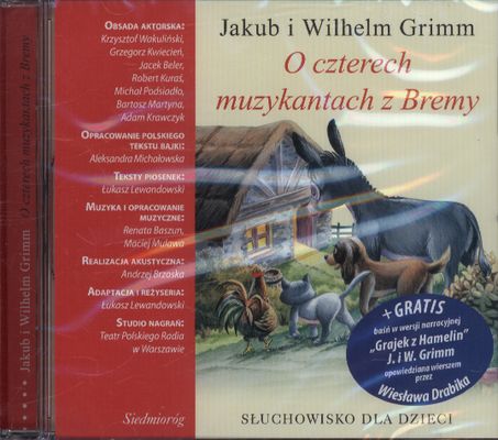 O czterech muzykantach z Bremy. Słuchowisko dla dzieciDawno temu, kiedy rodzice byli jeszcze dziećmi, na co dzień słuchano w radiu czy z płyt inscenizacji bajek. Wielu rodziców do dziś jeszcze pamięta niezwykły urok i klimat tych słuchowisk, a niejeden potrafi zaśpiewać swoim dzieciom niegdyś zasłyszane piosenki. I oto raz jeszcze zebrali się w Teatrze Polskiego Radia najwybitniejsi aktorzy, żeby zinterpretować dla dzieci bajki. Powstały słuchowiska o niecodziennym rozmachu i na niespotykanym poziomie reżyserskim, muzycznym i aktorskim. Literacki, a zarazem współczesny język, budująca bajkową atmosferę i napięcie narracja, żywe dialogi pomiędzy bohaterami, różnorodny podkład muzyczny i akustyczny, wzruszające piosenki: wszystko w tych nagraniach składa się na ich niezwykły charakter. Wydawca gwarantuje, że każdy, kto wysłucha tych bajek, będzie nimi zachwycony i zapragnie dać je do przesłuchania swoim dzieciom. ATUTY WYDANIA ♦ Najciekawsze bajki z kanonu literatury polskiej i światowej.♦ Doskonała reżyseria i opracowanie muzyczne.♦ Hollywoodzkie wykonanie przez plejadę najlepszych polskich aktorów