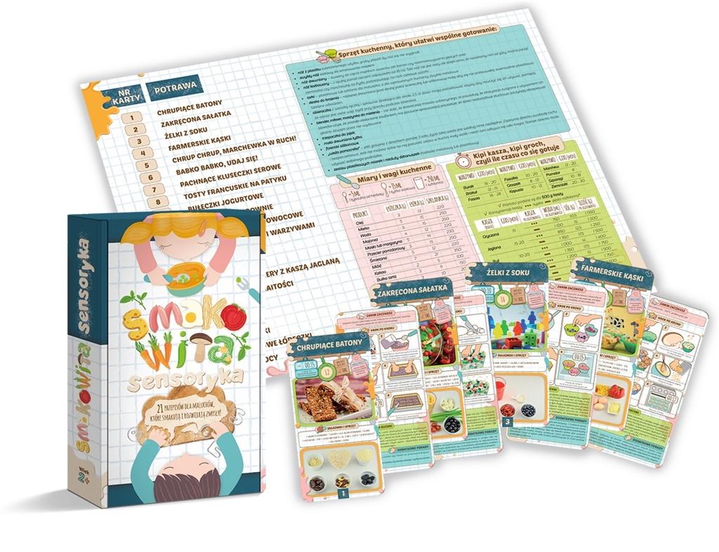 ""Smakowita Sensoryka"" to 21 przepisów, dzięki którym Twój maluch zostanie szefem kuchni, artystą i żądnym nowych przygód smakoszem! Każdy z przepisów uczy dzieci zabawy z jedzeniem, jednocześnie kładąc nacisk na sensoryczne doznania. Dzięki przepisom zawartym w tej książce Twój maluch pomoże Ci przygotować pyszne, pełne owoców i warzyw potrawy, a także niczym prawdziwy kucharz nauczy się technik gotowania! Oto kilka istotnych powodów, dla których warto zachęcić małe dzieci do gotowania: - rozwój zmysłów przepisy mobilizują do próbowania potraw o różnych smakach, fakturach i kolorach. Praca rękoma, ugniatanie, lepienie czy wałkowanie przygotowuje malucha do późniejszych czynności takich jak pisanie czy wiązanie butów. - wspólne gotowanie przygotowane razem jedzenie bardziej angażuje dziecko podczas posiłków i zachęca do próbowania nowych rzeczy. - ćwiczenie cierpliwości i komunikacji gotowanie rozwija ważne umiejętności społeczne, m.in. czekanie, podział obowiązków i dzielenie się. Dodatkowo liczenie i wypowiadanie nowych słów podczas gotowania to dobry sposób na wzmocnienie umiejętności językowych i matematycznych dziecka. - budowa poczucia własnej wartości przygotowując jedzenie, doświadczamy poczucia spełnienia, co wzmacnia pewność siebie i dumę ze swoich osiągnięć. - proste zasady czytelne instrukcje wypełnione zdjęciami i ilustracjami pozwolą maluchowi uczestniczyć w procesie gotowania, nawet jeśli nie umie jeszcze czytać. ""Smakowita Sensoryka"" to gwarancja pełnych brzuszków i pysznej zabawy! x