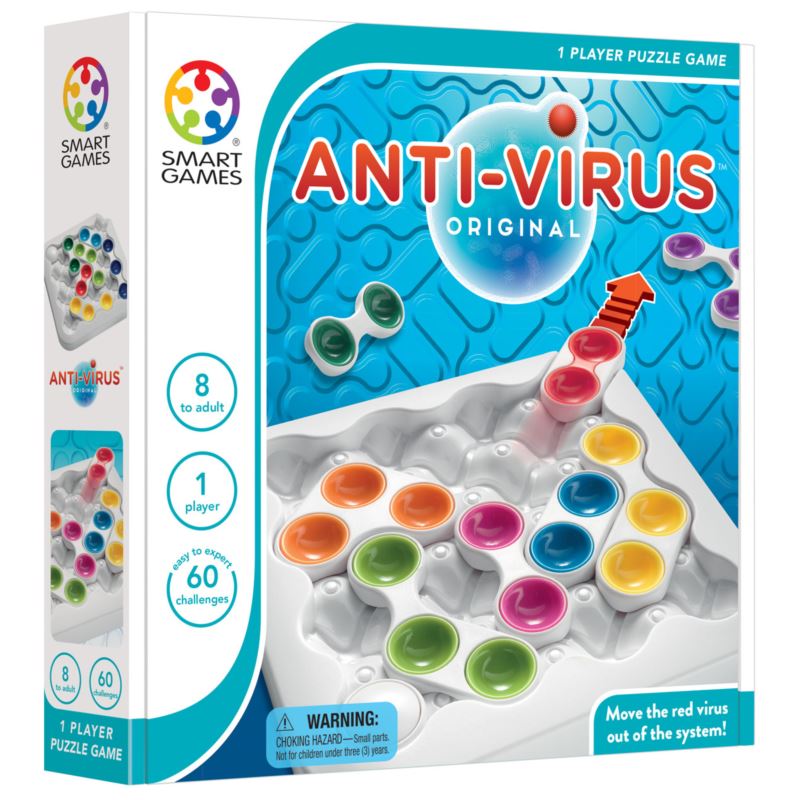 Antywirus"" to atrakcyjnie wydana gra logiczna. Celem gracza jest usunięcie czerwonego wirusa przez szczelinę w rogu planszy. 60 zadań o narastającym poziomie trudności, rozwinie u dziecka zdolność nieszablonowego myślenia i koncentrację. Czy zdołasz rozwiązać każde z wyzwań i pokonać wirusa?