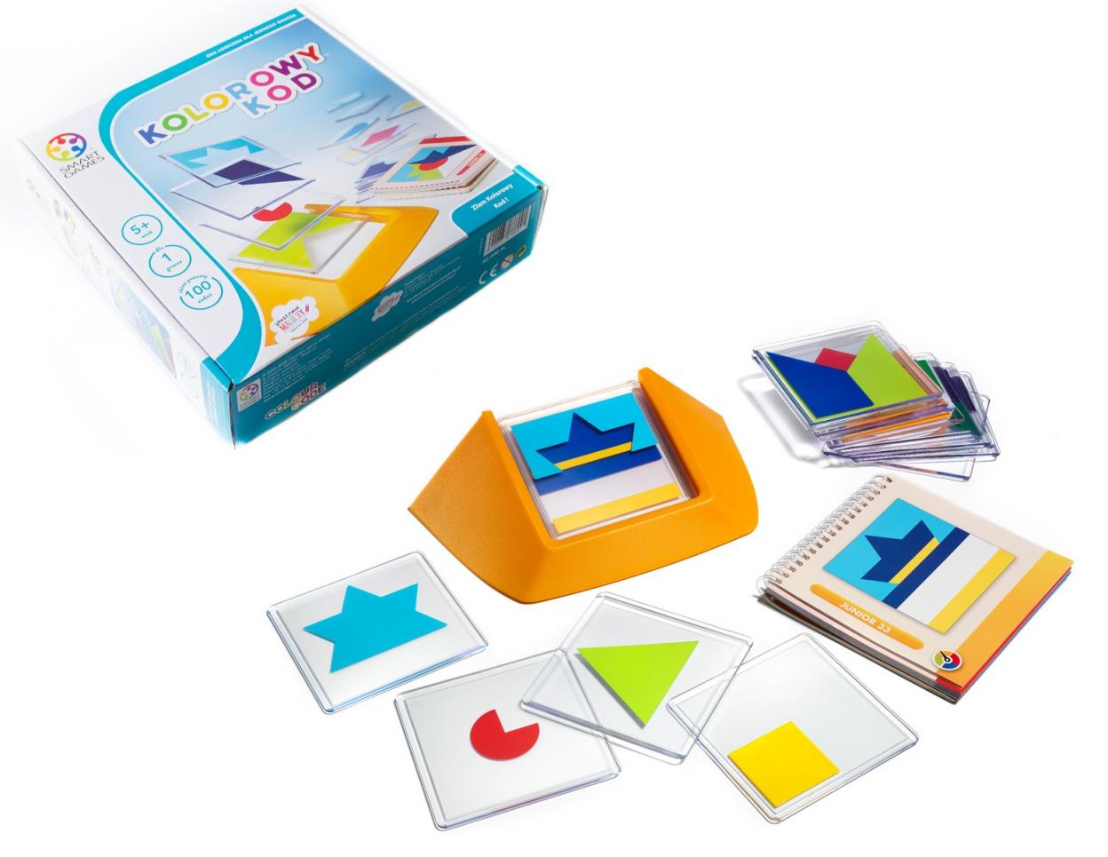 Kod koloru zawiera 18 pogrubionych, kolorowych kształtów, każdy na przezroczystej płytce. Wybierz wyzwanie, a następnie ustaw stos płytek, aby odtworzyć dokładnie kompozycję prezentowaną przez wyzwanie! Wspaniałe wprowadzenie do kolorów, kształtów, porządku, orientacji.