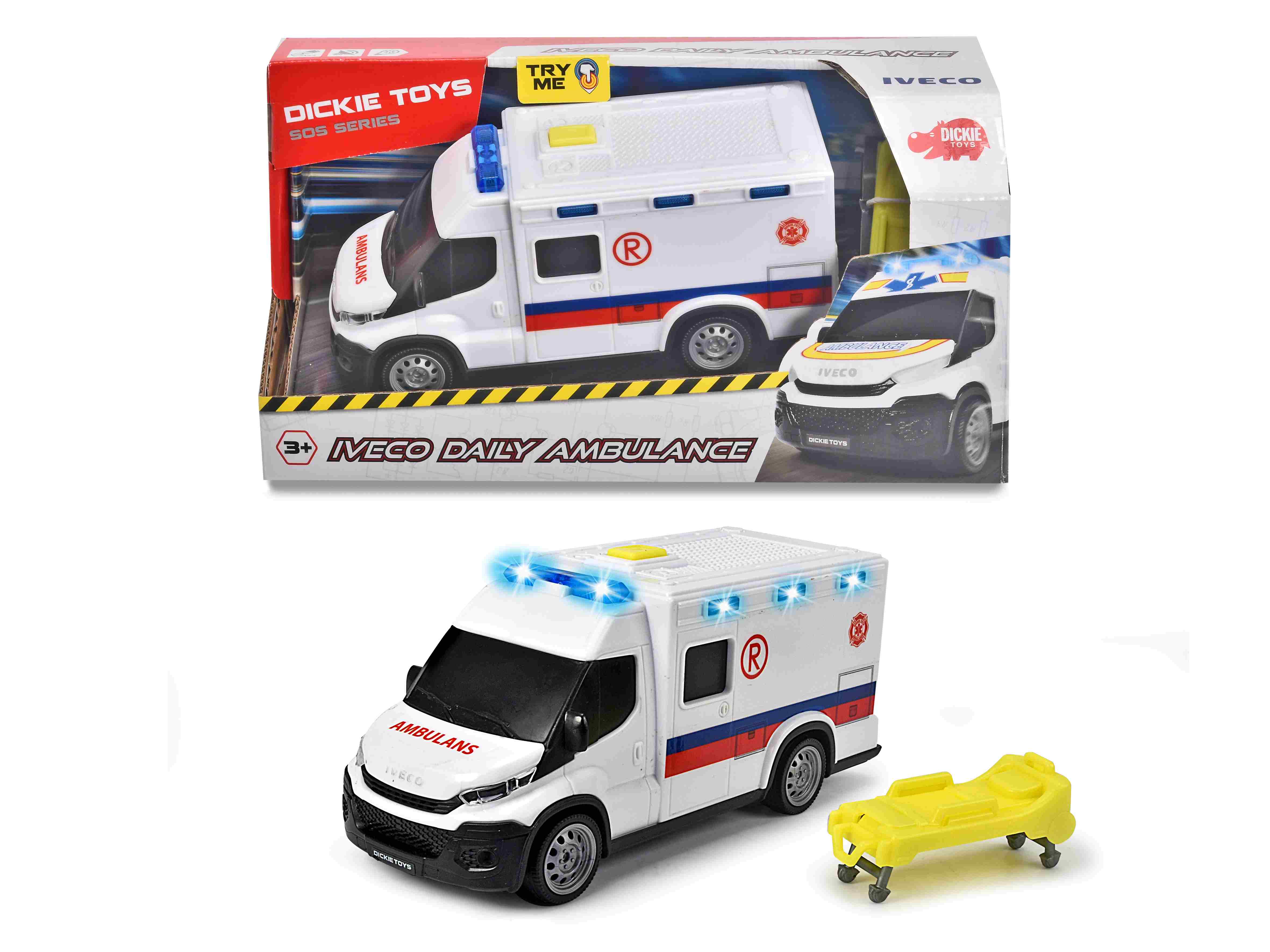 Należy do kolekcji pojazdów ratunkowych SOS w skali 1:32 - niemieckiej firmy Dickie. Dzięki noszom oraz otwieranymi tylnymi drzwiami dzieci od trzech lat mogą odtworzyć typowe, codzienne sytuacje. Światło i dźwięk sprawiają, że zabawa jest bardziej realistyczna. Otwierane drzwi dają swobodny widok na wnętrze. Charakterystyka: - Ambulans z napędem ciernym można łatwo pchnąć go po podłodze z dużą prędkością - Zestaw zawiera dodatkowo nosze - Zestaw jest wzbogacony przez efekty świetlne i dźwiękowe - Auto wykonane w skali 1:32 o długości 17 cm - Seria: pojazdy ratunkowe SOS - Marka auta: Iveco Daily x