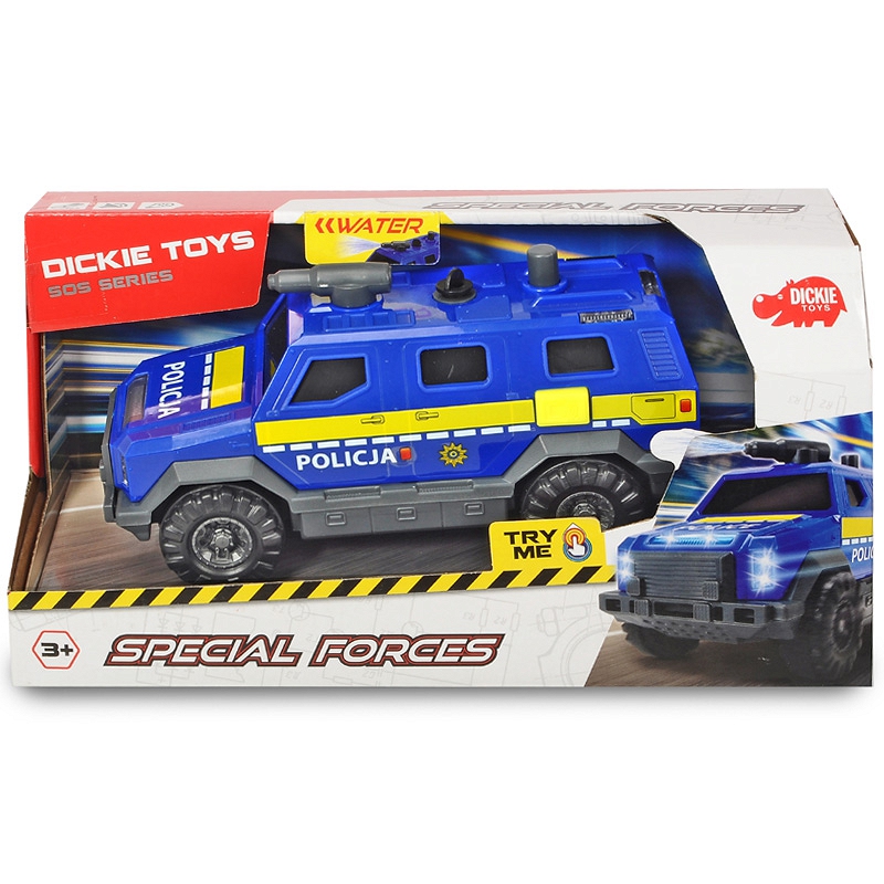 Pojazd służb specjalnych policji, bez napędu, światło i dźwięk, funkcja armatki wodnej, Try Me, 1:32, WERSJA POLSKA, baterie 3 x 1,5 V LR44 w zestawie, 18 cm.