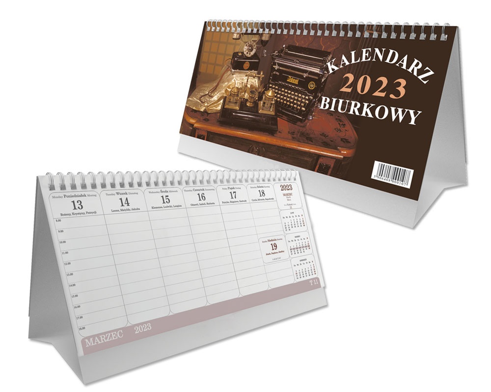 - 1 tydzień na stronie z miejscem na notatki Druk, papier: - 2 kolory, papier 70 g/m2 w kolorze białym Kalendarium: - w języku polskim, angielskim, niemieckim, potrójne imieniny, wschody i zachody Słońca, numeracja tygodni, skrócone kalendarium roku 2018, 2019 Oprawa: - grzbiet zaciskany spiralą do sztywnego kartonu formowanego w trójkątną podstawę x