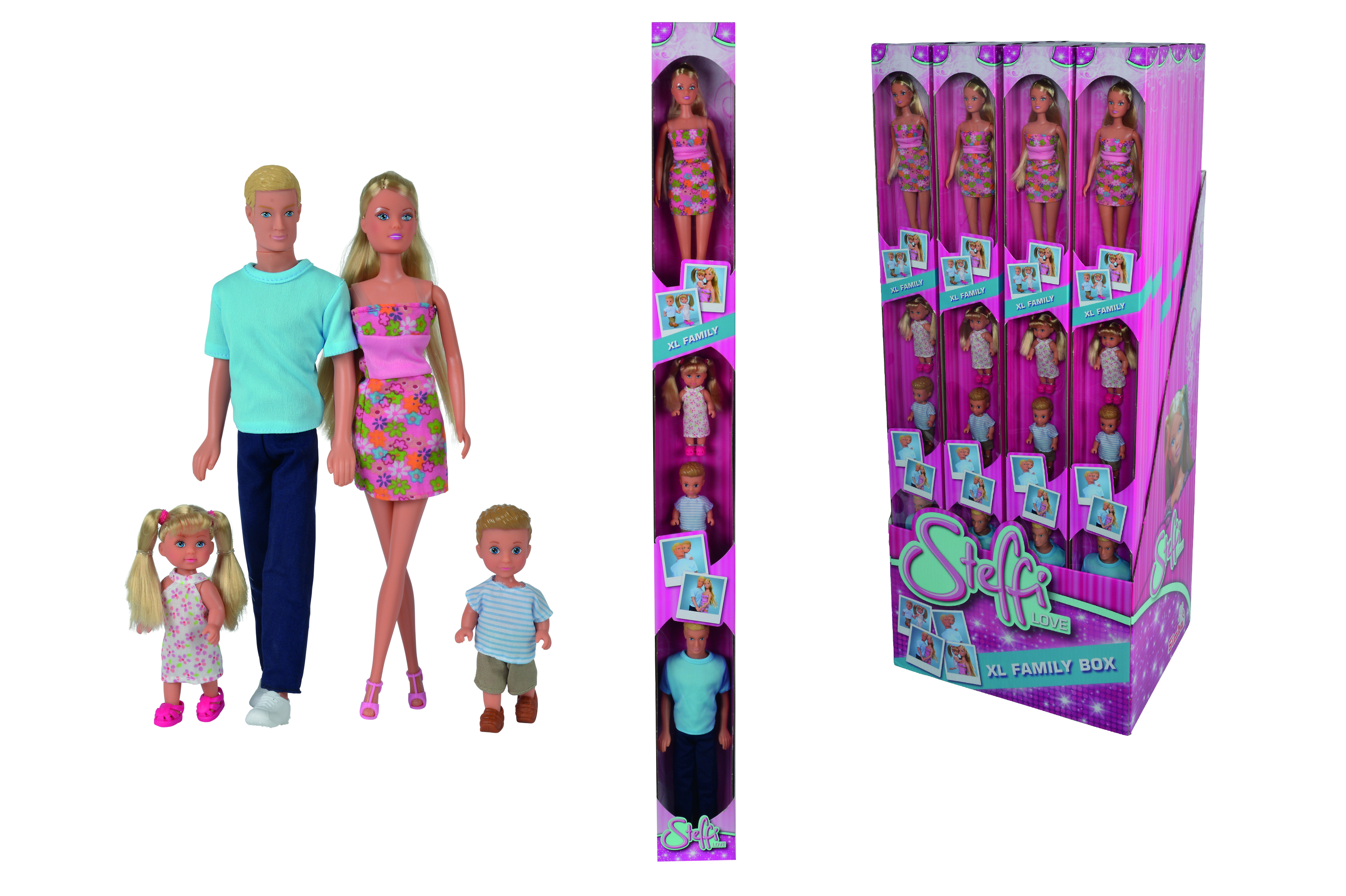 Steffi, Kevin, Evi i Timmy jako szcęśliwa rodzina. Wysokość lalek to: 29cm i 12cm.