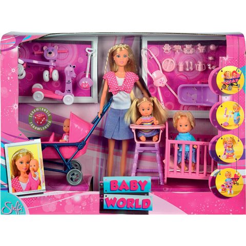 Lalka Steffi z trójką dzieci, z łóżeczkiem, krzesełkiem, jeździkiem i wieloma akcesoriami.