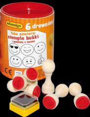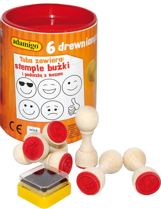 Zestaw 6 drewnianych pieczątek do kolorowania. W tubie oprócz stempli, znajduje się poduszka z tuszem. Kreatywna zabawa dla najmłodszych!