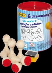 Zestaw 6 drewnianych pieczątek do kolorowania. W tubie oprócz stempli, znajduje się poduszka z tuszem. Kreatywna zabawa dla najmłodszych!