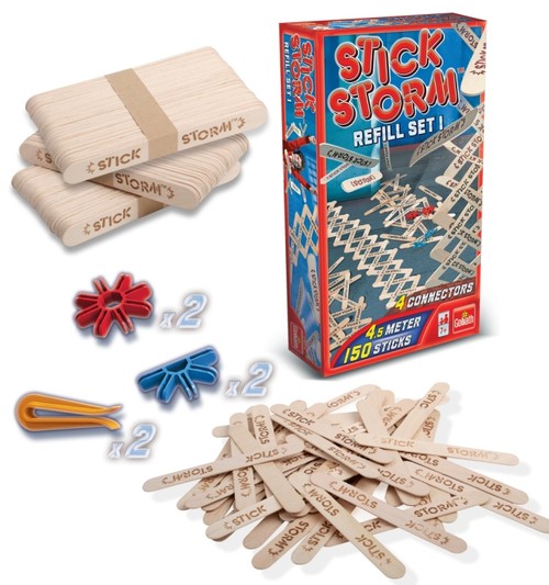 Stick Storm czyli burza patyczków. Trudno zrozumieć zanim zobaczy się te niepozorne patyczki w akcji. Dzięki elementom zestawu i specjalnej technice montażu zabawka umożliwia konstruowanie widowiskowych tras z patyczków. Następnie ułożona konstrukcja w spektakularny sposób, wijąc się niczym wąż, błyskawicznie rozsypuje się w powietrzu!Słowa nie mogą tego opisać zobacz sam Stick Storm w akcji! Zestaw StickStorm Dodatek 1 zawiera: 150 patyczków Stick Storm (~4,5 metra konstrukcji), 4 złączki konstrukcyjne (oraz 2 spinki).