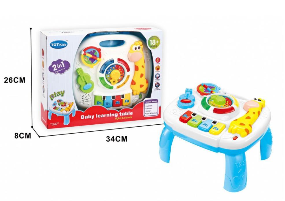 Dzieci poznają świat poprzez zmysły, dlatego tak ważne jest, aby je ciągle stymulować. Najlepszym sposobem na to jest nauka poprzez zabawę. Nasze zabawki dzięki swojej strukturze, żywym kolorom oraz dźwiękom świetnie się do tego nadają. Każda część stolika zawiera inną, kolorową zabawkę, co zachęci dziecko do poruszania się wokół stolika. Zabawka posiada dwustopniową regulację głośności, wystarczy przesunąć przełącznik, a zabawka będzie grała głośniej lub cichutko. Wszystkim efektom dźwiękowym towarzyszą efekty świetlne. Dziecko może obracać książeczkę, poznawać zwierzątka, a jednocześnie ćwiczyć zdolności manualne. Stolik posiada regulowane, gumowe paski pozwalające zamontować zabawkę do łóżeczka. Stolik posiada również uchwyt do wygodnego przenoszenia. Wymiary stolika: 26 cm x 17 cm x 27 cm Stolik zasilany jest bateriami: 3 x 1,5V - AA(brak w zestawie) Posiada certyfikat europejski x