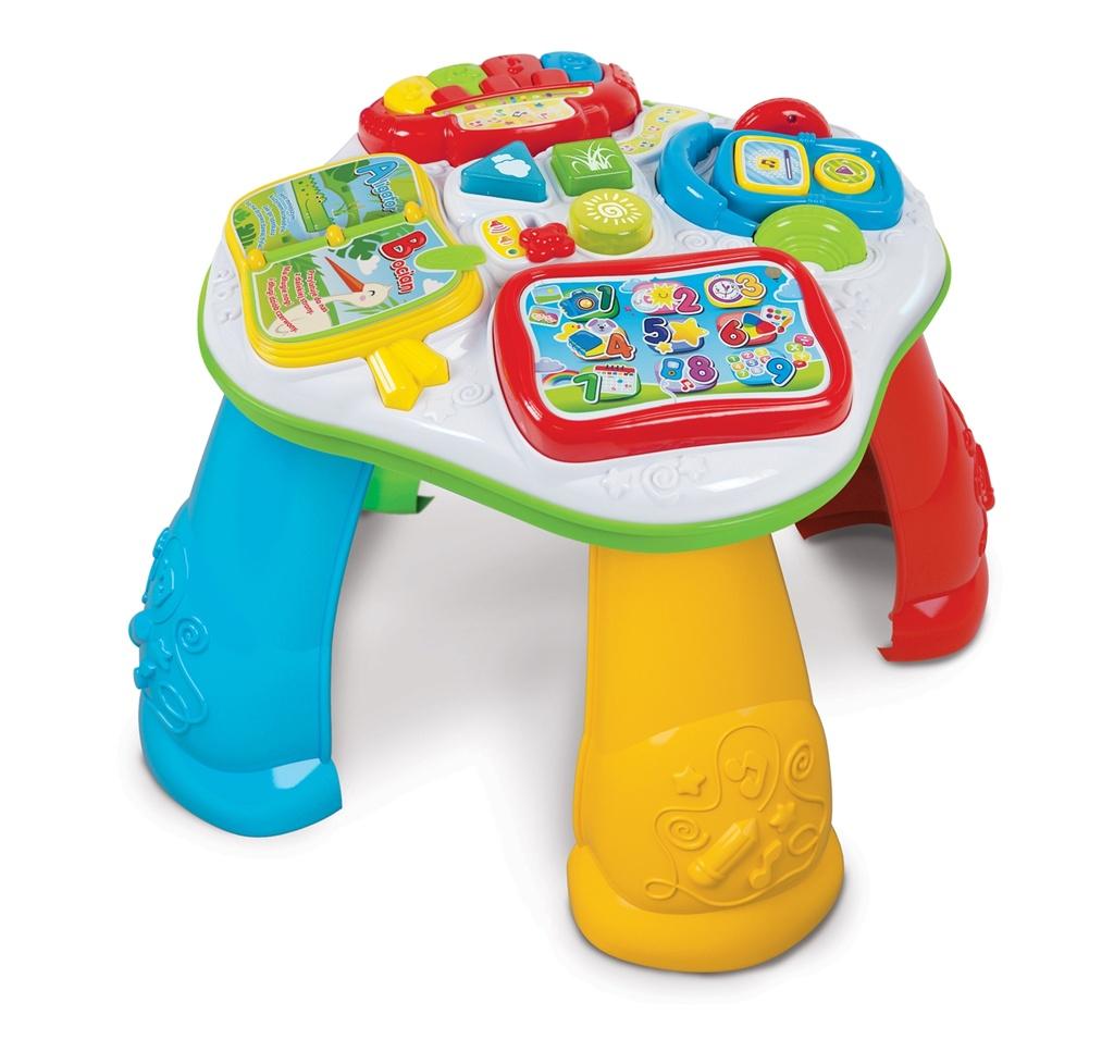 Interaktywny stolik z wieloma aktywnościami stymulującymi słuch i wzrok. Elektroniczna mówiąca zabawka, idealna do nauki pierwszych cyfr, liter, kształtów i kolorów. Pobudza zdolności manualne, słuch i wzrok. Zawiera "panel dotykowy" z interaktywnymi klawiszami. Odtwarzacz muzyki i fortepian gra mnóstwo zabawnych piosenek. Kolorowa książka uczy liter i nazwy zwierząt.