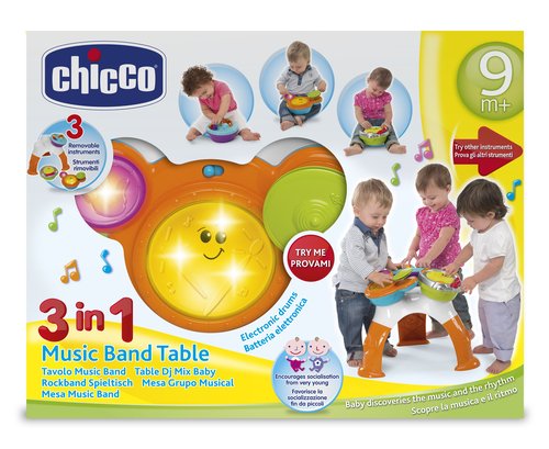 Zabawka - centrum aktywności oferuje aż 8 różnych atrakcyjnych zabaw manualnych i 3 instrumenty! Z zabawki może jednocześnie korzystać więcej dzieci, co rozwija umiejętności wspólnej, zgodnej zabawy i daje tym większą frajdę. Zabawka rozwija i kształtuje także uzdolnienia muzyczne dziecka. Na stoliku znajdziemy: Perkusję z 3 elektronicznymi zabawami, 4 światłami diodowymi i 3 trybami odtwarzania dźwięku: luźna gra na perkusji, odtwarzanie dźwięku, komponowanie. Marakasy z rolką, w której przesypują się koraliki, z kolorowymi blaszkami do zabawy. Konsolę DJ'a z wieloma zabawami manualnymi takimi jak: suwak, dysk do miksowania oraz igła magnetofonowa. Wszystkie 3 panele można zdjąć i bawić się nimi oddzielnie.