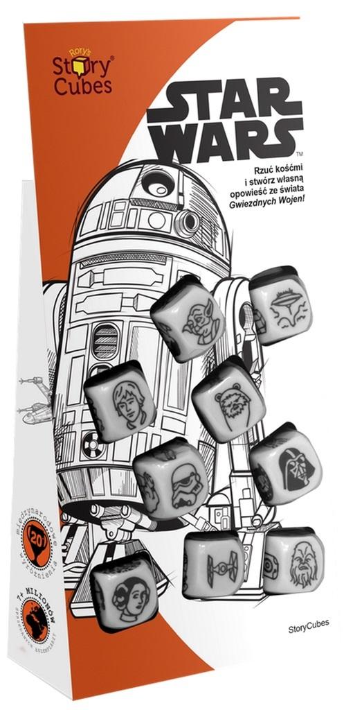 9 kości, 54 obrazy, nieskończona ilość opowieści ze świata Gwiezdnych Wojen! Oto prosta w założeniach i jednocześnie genialna gra, która dostarczy Wam wiele radości, stanowiąc przy tym doskonały trening pomysłowości i wyobraźni. Story Cubes: Star Wars to 9 estetycznie wykonanych, sześciennych kostek, z których każda zawiera na ściankach odmienny zestaw ilustracji inspirujących do tworzenia własnych, oryginalnych opowieści! W tym zestawie znajdziesz kości z grafikami związanymi ze światem Gwiezdnych Wojen,.Na czym to polega? Rzuć wszystkimi kostkami. Rozpocznij swoje opowiadanie od ""Dawno, dawno temu, w odległej galaktyce..."". Następnie opowiedz historię w oparciu o 9 obrazów, które wypadły na kostkach. Zacznij od dowolnego, najlepiej od tego, który jako pierwszy przykuł Twoją uwagę. Nie ma złych odpowiedzi, jedyne co Cię ogranicza, to Twoja własna wyobraźnia. Obudź ją w sobie i daj się jej ponieść, a fantastyczne opowieści same zrodzą się w Twojej głowie!Dlaczego pokochasz tę grę?