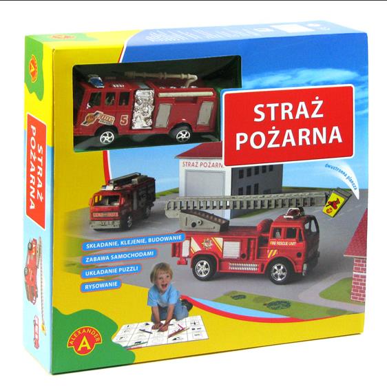 Straż Pożarna to zabawka składająca się z elementów, które trzeba skleić, złożyć i ustawić, by powstało właściwe miejsce do zabawy. Należy rozpocząć od sklejenia domków, następnie z 12 puzzli trzeba ułożyć planszę. Kiedy to się uda, można ustawić na niej sklejone budowle i zacząć jazdę strażackimi wozami. Na odwrotnej stronie planszy - puzzli znajdują się kontury znaków drogowych i ich nazwy. Jeśli znudzi się zabawa w straż pożarną, można zdemontować planszę, odwrócić puzzle na drugą stronę, a następnie układać je tak, by powstała tablica znaków drogowych. Znaki są czarnobiałe, ale dzięki kolorowym kredkom, znajdującym się w opakowaniu zabawki, można je pokolorować według załączonego wzoru - to doskonała okazja do nauki ich wyglądu i znaczenia.