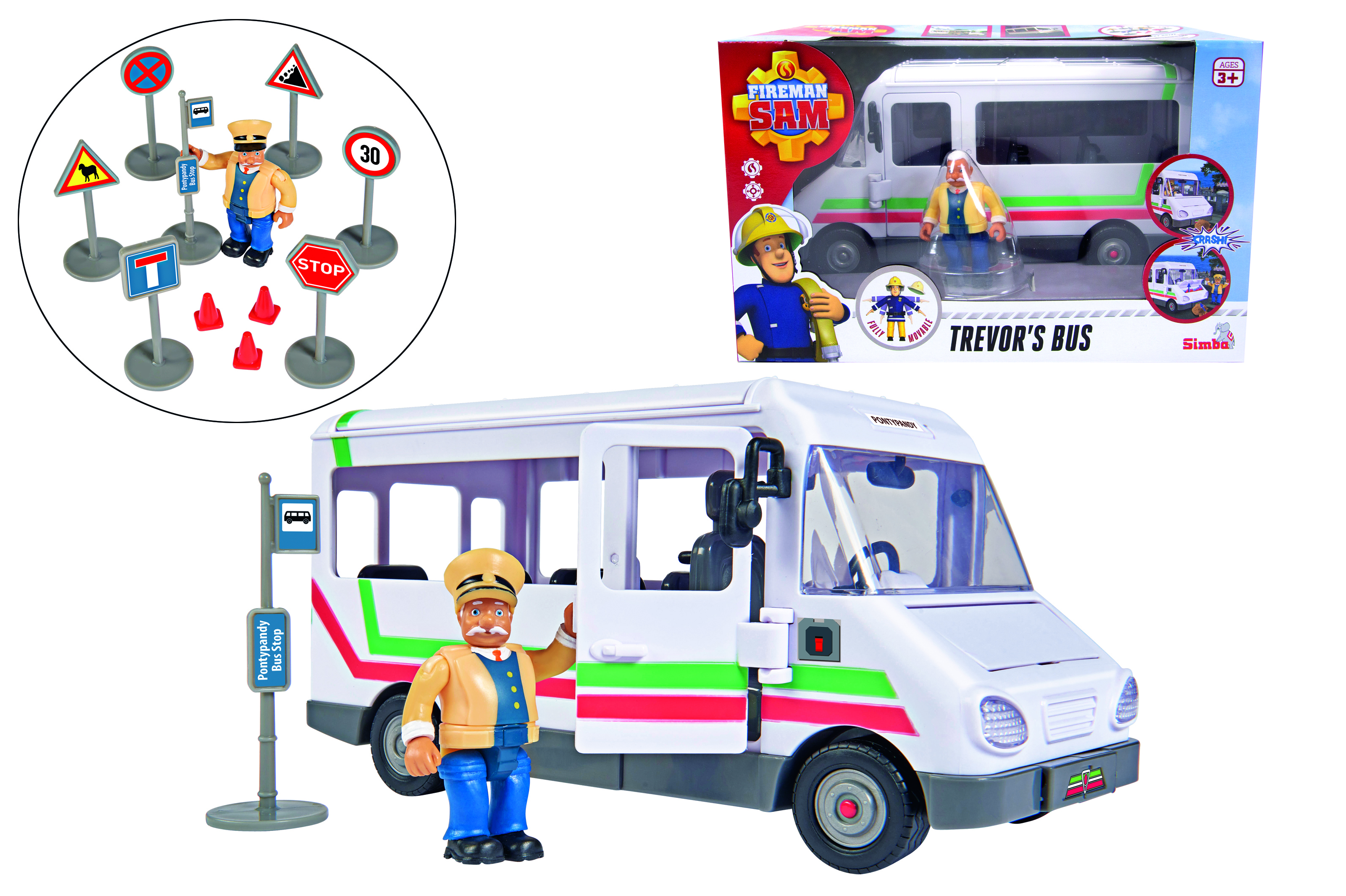Autobus Trevora z bajki Strażak Sam ma otwierane drzwi i otwierany dach. Maska autobusu otwiera się