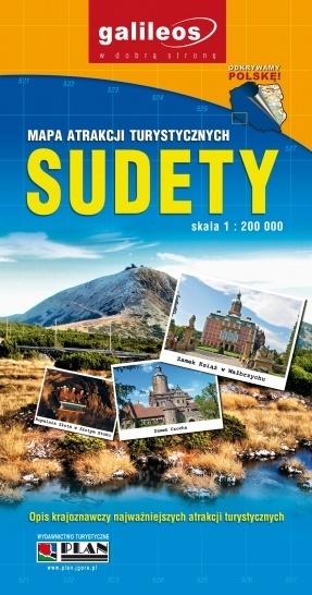 Mapa krajoznawcza Sudetów z zaznaczonymi najważniejszymi atrakcjami turystycznymi regionu. Dodatkowo mapa zawiera grafiki poszczególnych atrakcji. Mapa jest aktualizowana w terenie i przedstawia faktyczny stan na 2015 r. Na rewersie znajduje się słowniczek krajoznawczy Sudetów.