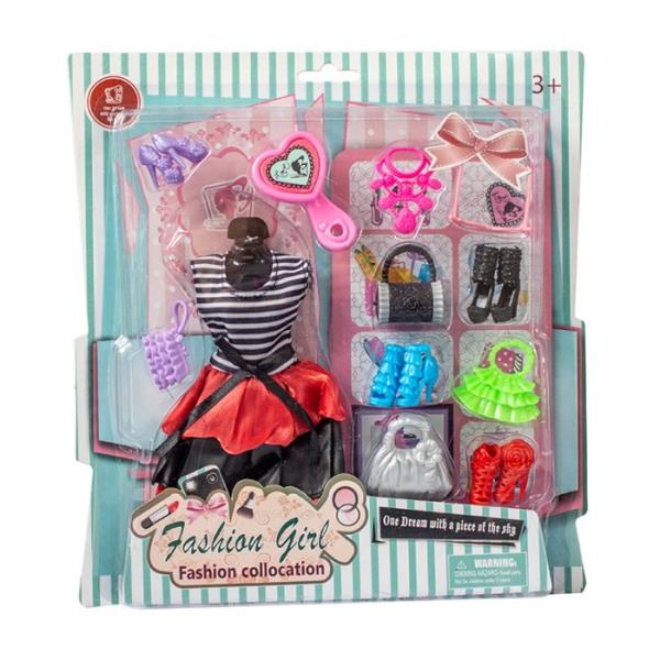 W zestawie znajduje się sukienka i 11 dodatków do stroju: buty, torebki, okulary, bizuteria. x