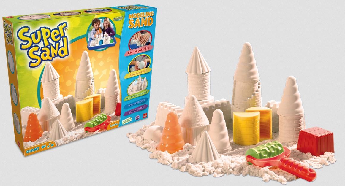 Odkryj przyjemność tworzenia pełnych detali zamków i geometrycznych kształtów. Dzięki zestawowi GIGANT twoje możliwości są GIGANTYCZNE! Korzystaj z załączonych foremek i pozwól się ponieść fantazji! Zamki na piasku Lato słońce i plaża. Super Sand przenosi lato i zabawę piaskiem do domu.Super aksamitne w dotyku, suche a jednocześnie antybakteryjne i 100% naturalne, takie jest tworzywo Super Sand. Piasek, który można używać jeszcze raz i jeszcze raz i jeszcze Zrób babkę z piasku albo zamek z fosą. Dołączone narzędzia i piękne foremki pomogą stworzyć czego dusza zapragnie. Masa Super Sand składa się z naturalnych składników mineralnych. Jeżeli coś się rozsypie poza piaskownice, nie ma problemu ponieważ masa ma specjalną strukturę pomagającą w utrzymaniu czystości. Super Sand stymuluje kreatywność dzieci. Daj się ponieść swojej wyobraźni i ciesz się swoimi kreacjami z Super Sand! Dotknij aby poczuć różnice. Zestaw zawiera: 1350 g super piasku, gigantyczny pojemnik na piasek (kuweta), 4 duże foremki w tematyce zamku, 1 foremka różek-ślimak, 6 foremek w geometrycznych kształtach, 2x kształt półkuli, 2x kształt półcylindra, 1x kształt rożka/stożka, 1x kształt sześcianu, 2 rolki odciskające kształt (cegieł, oraz bruku) + 1 rączka, 1 kielnia.