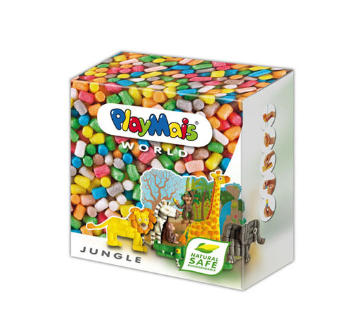 Świat Dżungli to zestaw dla przyszłych odkrywców i obieżyświatów. Wprowadza dziecko w świat dzikich, afrykańskich zwierząt. Uczy dwuwymiarowego kształtowania. Kreatywny zestaw tematyczny umożliwiający zbudowanie Dżungli zawiera: ponad 1000 PlayMais, tekturową, laminowaną, kolorową oraz trójwymiarową makietę, 6 dwuwymiarowych szablonów dzikich afrykańskich zwierząt do wyklejania, gąbeczka, biodegradalny nożyk, instrukcje do zestawu Dżungla, która ukazuje jak wykonać: lwa, krokodyla, żyrafę, małpę, słonia lub zebrę. Nie trzeba kleju!!!...wystarczy trochę wody. Koniec z brudnymi dywanami i stołami. Wyprodukowany w Niemczech ze skrobi kukurydzianej i barwników spożywczych, PlayMais jest ekologicznym materiałem kreatywnym, który gwarantuje świetną i przede wszystkim bezpieczną zabawę. Nie zawiera żadnych substancji szkodliwych dla zdrowia. Nie istnieje też ryzyko zadławienia w wypadku przypadkowego połknięcia przez dziecko - PlayMais rozpuści się.