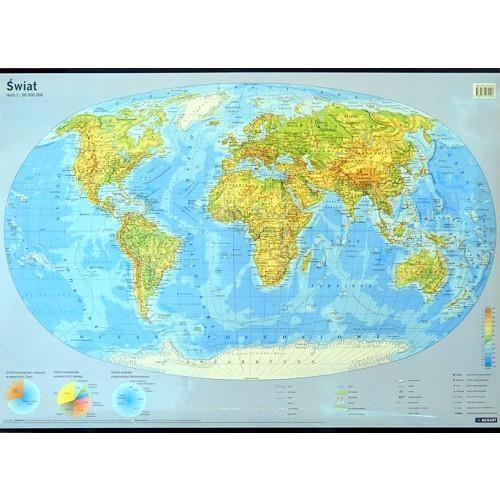 Świat - mapa ścienna w skali 1 : 60 000 000 - fizyczno-polityczna. Przejrzystemu obrazowi ukształtowania lądów i oceanów towarzyszą takie elementy treści jak: główna sieć rzeczna i najważniejsze jeziora, opisy ważniejszych krain geograficznych, wysp, półwyspów, mórz, basenów i grzbietów oceanicznych. Stolice państw oraz wielkie miasta, a także granice krajów i terytoriów zależnych dopełniają obraz współczesnego świata.