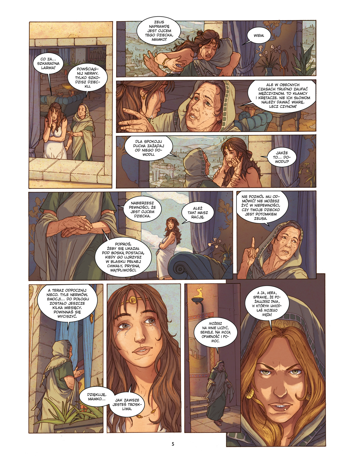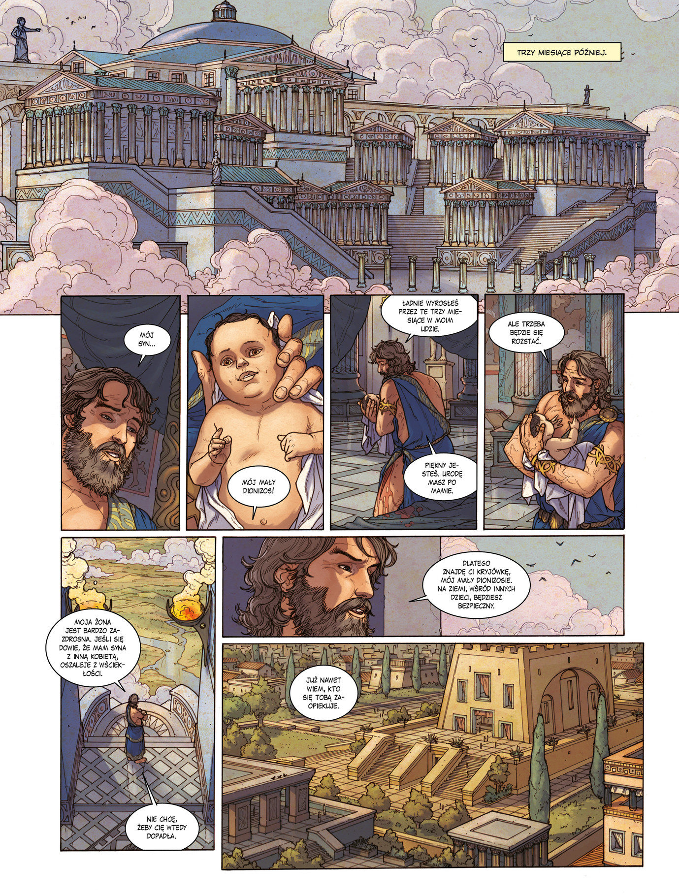 Komiksowa adaptacja mitu o półbogu Dionizosie, synu Zeusa i śmiertelniczki Semele. Od urodzenia musiał ukrywać się przed gniewem Hery, trawionej zazdrością o niewiernego męża, króla wszystkich bogów. Najpierw dorastał w kobiecym przebraniu, później – przemieniony w koźlę – mieszkał w lesie z nimfami. Jako młodzieniec przemierzał świat, a jego kult zataczał coraz szersze kręgi. Na jego cześć wyprawiano hulaszcze orgie, podczas których oddawano się najdzikszym perwersjom seksualnym. I chociaż Dionizos miłuje swoich wyznawców – satyrów i menady – ulegających bezwstydnym, pierwotnym instynktom, wobec wrogów bywa bezlitosny. Tych, którzy nie raczą uznać jego boskości, wpędza w wyniszczający, morderczy obłęd.