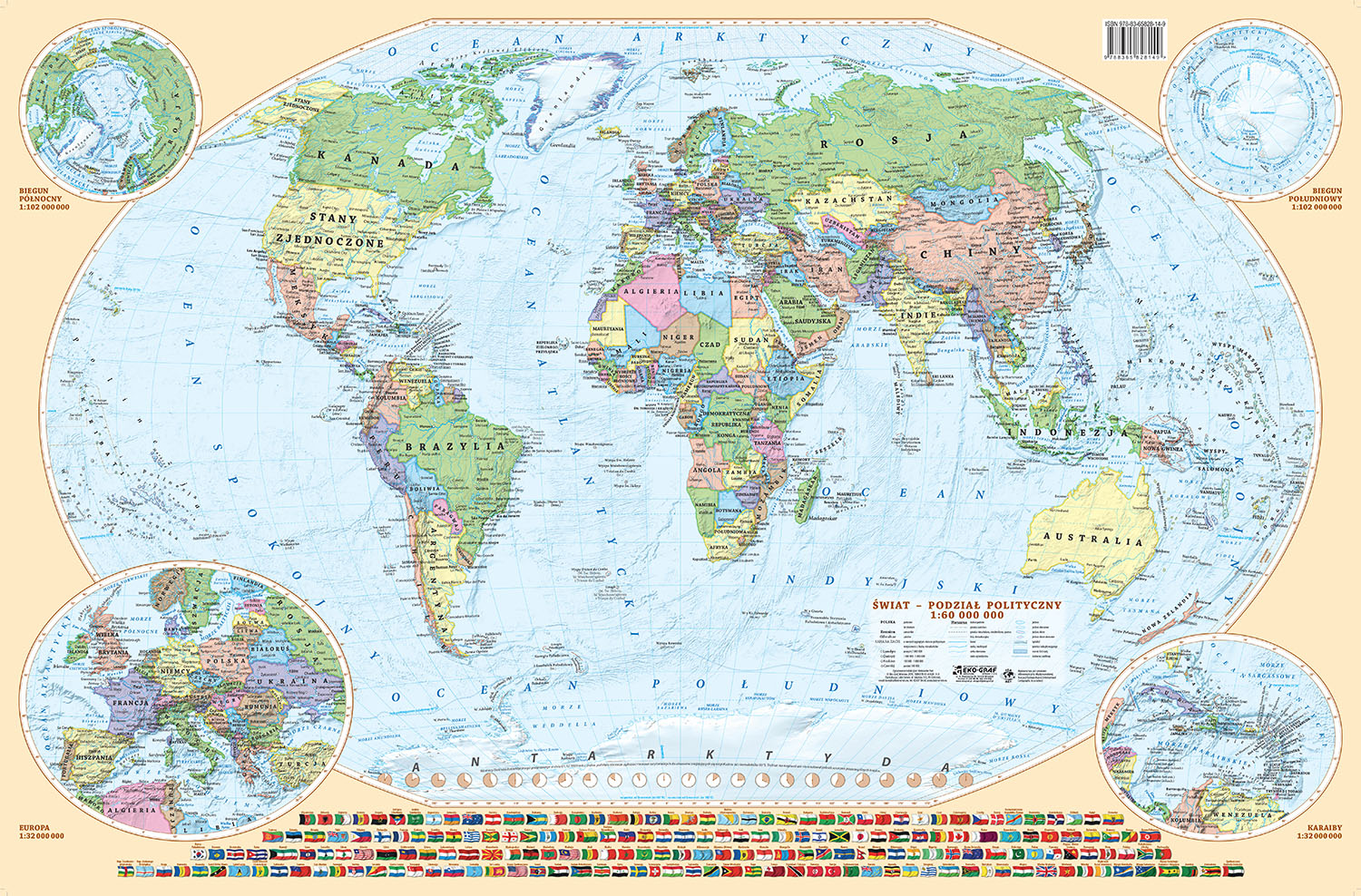 Znakomicie przygotowana, dwustronna podkładka na biurko z mapą świata w skali 1:60 000 000, polityczną (awers) oraz fizyczną (rewers). Prezentuje najważniejsze, aktualne informacje o kontynentach świata. Ciekawie zaprojektowana, oprócz map, mieści również dodatkowe elementy, pomocne w poznawaniu świata.