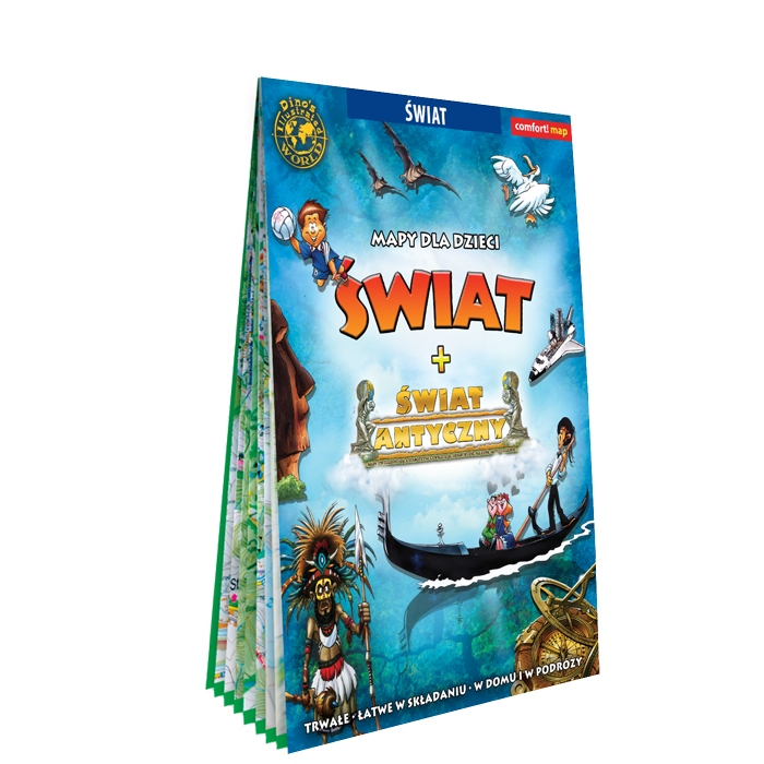 Świat + Świat antyczny. Mapy dla dzieci to doskonały produkt, który posłuży nie tylko zabawie, lecz także nauce. Niemal 500 ilustracji prezentuje kulturę, historię, folklor, architekturę, kuchnię oraz faunę i florę charakterystyczne dla wszystkich regionów świata. Znajdują się tu również ciekawostki dotyczące lotnictwa, sportu czy odkryć geograficznych. Rysunki są kolorowe, humorystyczne i przystępne dla dzieci - dzięki temu nawet najmłodsi odkrywcy z łatwością zdobędą ogólną wiedzę o świecie. Dodatkiem znajdującym się na odwrocie mapy świata jest bogato ilustrowana mapa świata antycznego. Przedstawia ona postaci, przedmioty i wydarzenia znane ze starych baśni i mitów: pirackie statki, tajemnicze miejsca, morskie i lądowe stworzenia oraz legendarnych bohaterów, którzy obecni są w naszej kulturze od starożytności. Atrakcyjne, kolorowe rysunki pozwolą dzieciom usystematyzować wiedzę o fantastycznym, fascynującym świecie dawnych legend. x